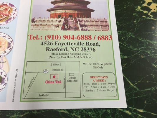 1150 Old Us Highway 1 S Southern Pines NC 28387. If you visit their location its clear they know what they are doing which is cook good food. China Wok Raleigh.