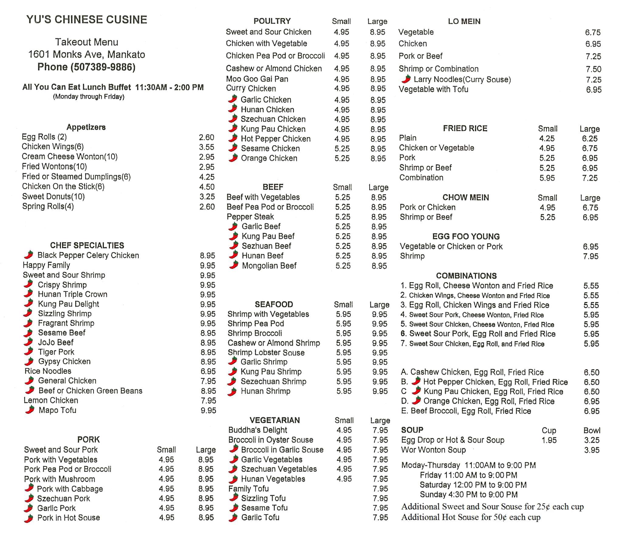 Yu S Chinese Cuisine Menu Menu Restauracji Yu S Chinese Cuisine Mankato Mankato