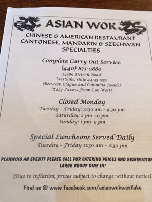 Please contact the restaurant directly. Get the latest Asian Wok menu and prices along with the restaurants location phone number and business hours.